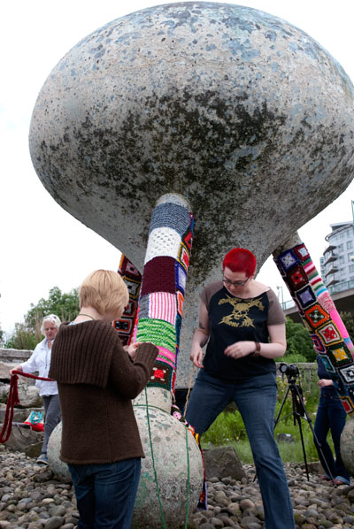 To give you a glimpse of what yarn bombing looks like in the field, here are a couple of local Vancouver, British Columbia installations: